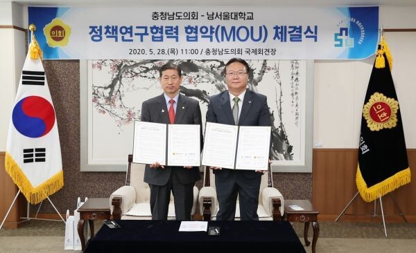 유병국 의장은 “도정·교육행정의 복잡·다양화로 의정활동 전문성 강화가 요구되는 시점에 전문성 있는 교수진을 보유한 남서울대와 힘을 모으게 돼 기쁘다”며 “이번 협약은 향후 충남 의정과 자치발전을 위한 공동연구 수행에 중요한 토대가 될 것”이라고 말했다.