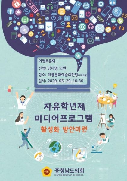 김 의원이 좌장을, 보령교육지원청 서정문 교육장이 ‘중등교육과정 미디어프로그램 활성화 방안’에 대해 발제하고 충남도교육청 정희순 장학사와 계룡시의회 윤재은 의원, 코리아플러스 장영래 대표, 한국평생학습지원센터 천광노 이사장, 대전세종발전연구원 한상헌 책임연구원이 토론자로 참여해 다양한 의견을 제시할 예정이다.