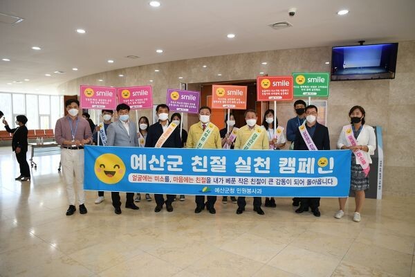 이날 진행된 캠페인은 ‘얼굴에는 미소를, 마음에는 친절을’, ‘친절한 예산, 섬김 받는 군민, 우리 함께 만들어요’ 등 문구가 적힌 현수막과 피켓을 활용해 친절 실천 다짐 메시지를 전달했다.
