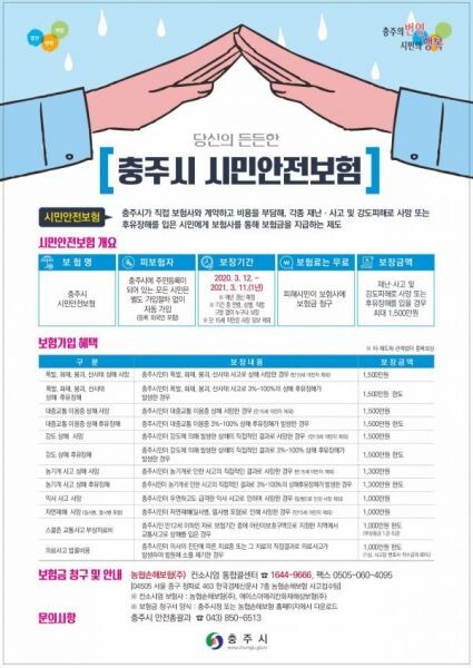 시민안전보험은 충주시에 주민등록이 된 시민이면 누구나 자동으로 가입되어 예상치 못한 재난 및 사고로부터 최소한의 경제적 도움을 받을 수 있는 제도적 장치다.