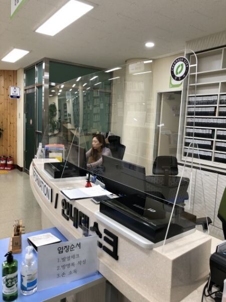 자료실 데스크는 도서관 직원과 이용자의 접촉이 많은 공간으로 비말 감염 차단을 위해 설치했으며 가림막 아랫부분으로 회원증 및 서류를 주고받을 수 있는 통로가 뚫린 형태이다.