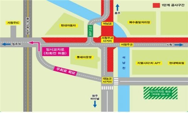 현재 서청주교사거리는 2019년 4월부터 석남교를 우회해 공사를 진행하고 있으며 서청주교는 청주역방향 반폭 교량 재가설이 완료돼 이번 3차 교통전환으로 시청방향 반폭 교량 철거와 시공을 진행할 계획이라고 전했다.