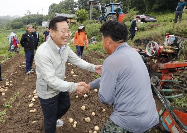 [무한뉴스] 이차영 충북 괴산군수가 본격 감자 수확철을 맞아 19일 이른 아침부터 감자를 수확하고 있는 감물면 농가를 찾아 격려하고 있다.