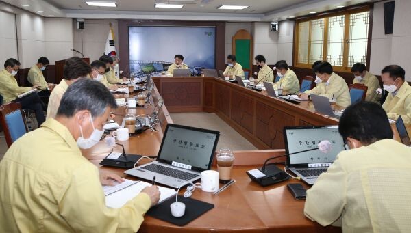 [무한뉴스] 한범덕 청주시장이 22일 소회의실에서 열린 주간업무 보고회에서 코로나19 방역 철저 등을 주문했다.