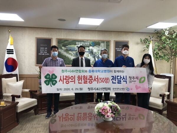 [무한뉴스] 청주시4-H연합회는 29일 헌혈캠페인으로 모은 헌혈증서 50장을 충북대학교 병원에 전달하는 시간을 가졌다.