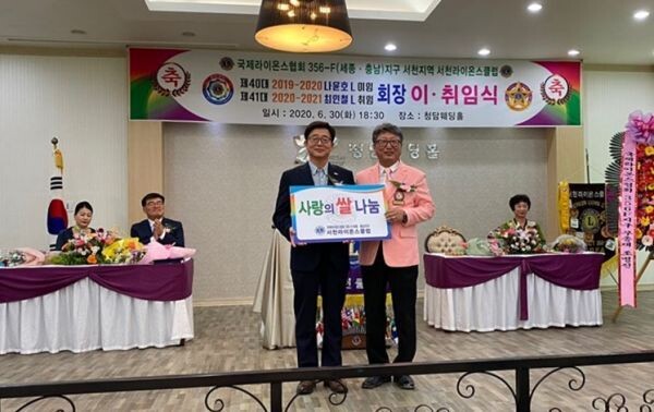 서천라이온스클럽은 지난달 30일 열린 국제라이온스협회 356-F지구 서천라이온스클럽 제40, 41대 회장 이·취임식에서 지역의 어려운 이웃에게 따뜻한 마음을 전하고자 일회성 꽃 화환 대신 쌀 화환을 받아 기탁하며 주변을 훈훈하게 했다.