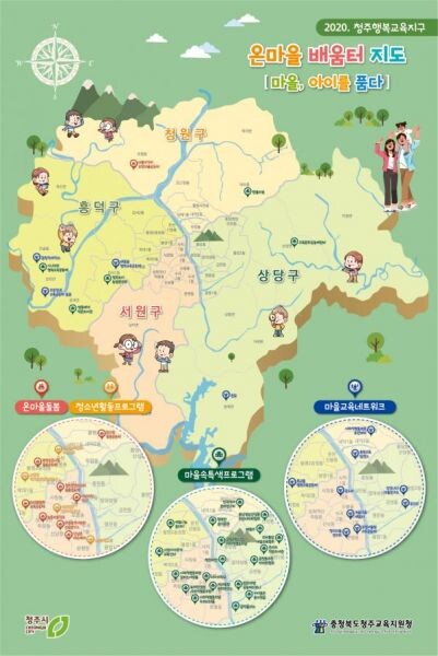 온마을 배움터 지도 [마을, 아이를 품다]는 청주시 4개 구별 각 마을에서 다양한 활동을 하고 있는 민간공모단체를 주민 및 학생들에게 소개하고 공유함으로써 청주행복교육지구 민간공모사업에 대한 참여를 확대하고 협력을 강화하기 위해 제작됐다.