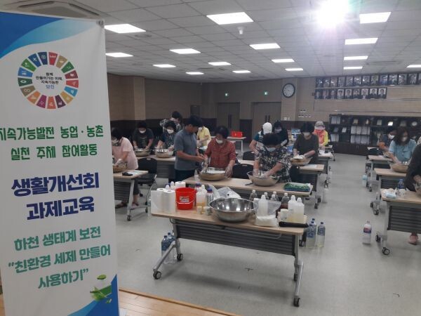 생활개선회 회원들이 배워 본 베이킹소다, 과탄산소다, 이엠 등으로 만든 친환경 이엠세제와 구연산, 향오일 유연제 등으로 만든 섬유유연제는 자연 생분해율이 90% 이상 되는 친환경 세제로 환경 훼손도가 낮아 생활하수로 인한 수질오염을 줄일 수 있다.