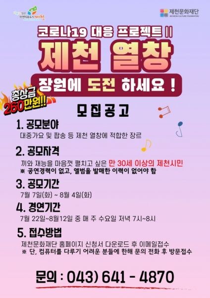 오는 22일을 시작으로 매주 수요일에 열리는 ‘제천열창’은 유튜브 라이브‘문화多방’에 이어 온라인을 통한 비 대면으로 이루어지는 두 번째 프로젝트로 현재까지 30여명의 참가자가 접수 완료했다.