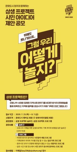 [무한뉴스] 코로나19로 문화 활동과 축제의 패러다임이 바뀌어버린 2020년, 그렇다면 이제 우리는 어떻게 놀아야할까? 청주시문화산업진흥재단 문화도시센터가 오는 8월 7일까지, 상생 프로젝트 시민 아이디어 공모 ‘그럼 우리 어떻게 놀지?’를 진행한다.