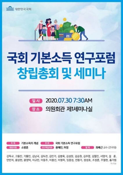 '국회 기본소득 연구포럼'은 30일 오전 7시 30분에 국회 의원회관 제1세미나실에서 창립총회 및 세미나를 열고 본격적인 활동을 시작한다.
