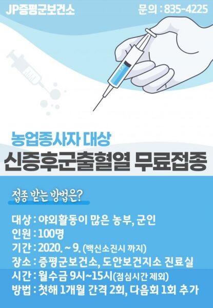 [무한뉴스] 증평군 보건소는 신증후군출혈열균에 노출될 가능성이 높은 농업종사자를 대상으로 ‘신증후군출혈열 무료예방접종’을 실시한다.