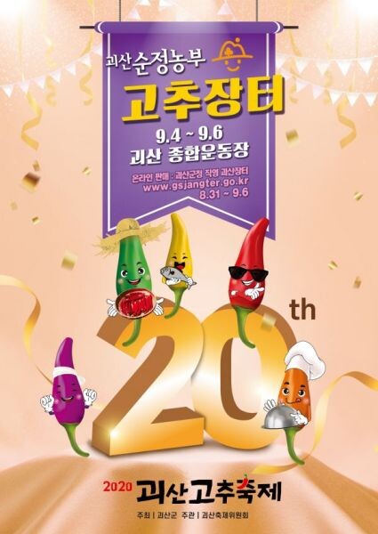 괴산군은 올해 고추축제를 ‘코로나19를 넘어, 2020 괴산순정농부 고추축제’라는 주제로 8월 31일부터 9월 6일까지 7일간 개최한다.