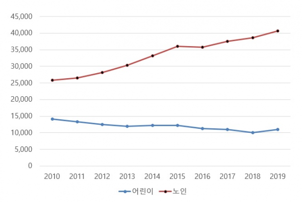 실제 경찰청이 윤 의원실에 제출한 ‘연도별 교통사고 현황’ 자료에 따르면, 전체 교통사고 건수는 2010년부터 지난해까지 연22만여건 수준으로 유의미한 변화가 없었으나 어린이 교통사고 건수는 2010년 1만4천95건에서 지난해 1만1천54건으로 9년만에 21.5%가 감소한 반면, 노인 교통사고 건수는 2010년 2만5천810건에서 지난해 4만645건으로 57.5%가 늘어 큰 폭으로 증가하고 있는 것으로 나타났다.