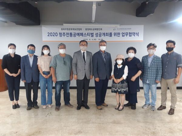 이날 협약식은 조직위가 오는 9월 25일~27일에 개최하는 ‘2020 청주전통공예페스티벌’ D-50을 맞아 진행됐으며 이날 협약을 계기로 조직위와 2개 단체는 페스티벌에 선보일 무형문화재 및 명인 관련 전시 콘텐츠를 공동기획하게 됐다.