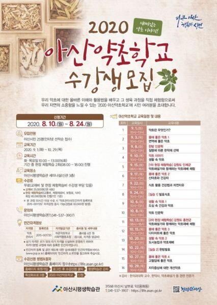 [무한뉴스]아산시는 약초의 종류, 약초의 효능과 활용, 재배 방법을 쉽고 재미있게 배울 수 있는 ‘2020 아산약초학교’ 프로그램을 운영한다.
