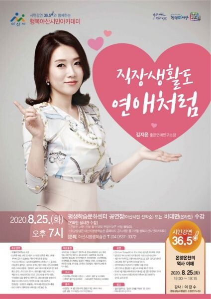 [무한뉴스]아산시가 오는 8월 25일 평생학습문화센터 아산 아트홀에 김지윤 좋은연애연구소장을 초청해 ‘직장생활도 연애처럼’이라는 주제로 행복아산 시민아카데미를 개최한다.