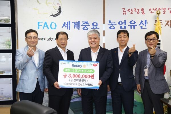 [무한뉴스]국제3680지구 금산로타리클럽은 지난 6일 금산군청을 방문해 코로나19로 어려움을 겪고 있는 군민들을 위해 써달라며 성금 300만원을 기탁했다.