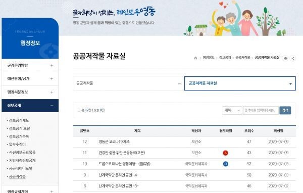 군은 자체 생산하는 각종 저작물을 군민들에게 개방해 활용할 수 있도록 하고 그 정보에 쉽게 접근할 수 있게 하기 위해 영동군 홈페이지에 ‘공공저작물 자료실’을 개설해 운영중이다.