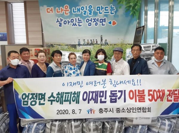 [무한뉴스] 충주시중소상인연합회는 지난 11일 엄정면행정복지센터를 찾아 집중호우로 큰 피해를 입은 주민들을 위한 이불 50채를 전달했다.