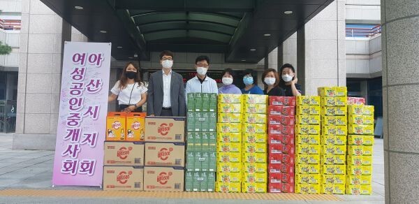 [무한뉴스]한국공인중개협회 아산시지회 여성공인중개사회가 수해 피해주민을 위해 지난 13일 아산시에 컵라면, 음료 등 100만원 상당의 물품을 기탁했다.
