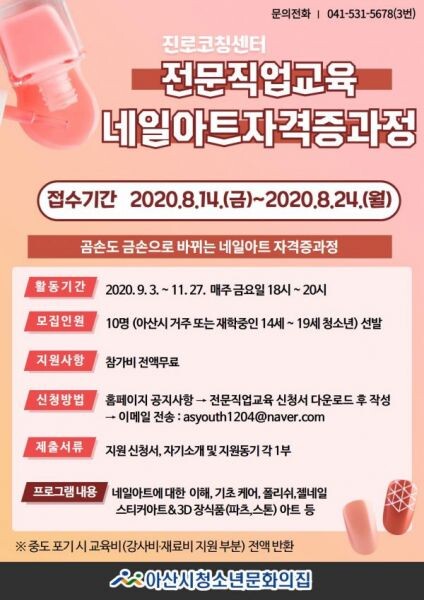 [무한뉴스] 아산시와 아산시청소년문화의집이 오는 24일까지 전문직업교육 ‘네일아트 자격증과정’ 참가자를 모집한다.