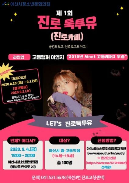 이번 진로톡투유(진로카페)에는 청소년의 관심 트렌드를 반영, 고등래퍼 이영지(2019년 Mnet 고등래퍼 3 우승자)를 초청해 공연과 Q&A 시간을 통해 소통하는 시간을 가질 예정이다. 행사는 오는 9월 4일 아산시청소년문화의집에서 진행된다.