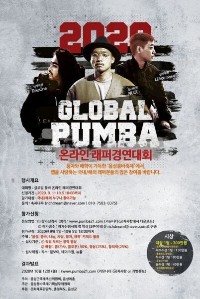 올해 개최되는 글로벌 품바 온라인 래퍼 경연대회는 다음달 1일부터 10월 5일까지 참가신청서와 3분 이내의 랩 영상을 이메일로 접수하면 음성품바축제 유튜브 채널에 게시된다.
