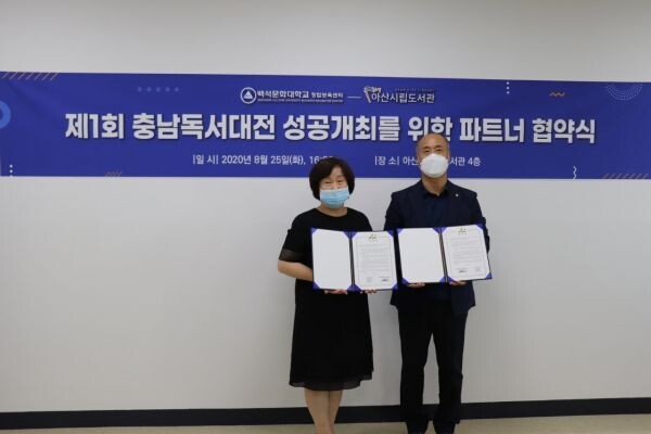 [무한뉴스]아산시와 백석문화대학교 창업보육센터가 지난 25일 ‘제1회 충남독서대전’ 온라인 작가강연 및 특강시스템 지원 협약을 맺었다.