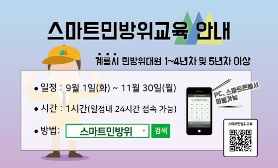 오는 9월 1일부터 11월 30일까지 1시간 동안 진행되는 사이버교육은 계룡시 소속 민방위 대원이면 누구나 PC와 스마트폰을 이용해 교육을 받을수 있다.