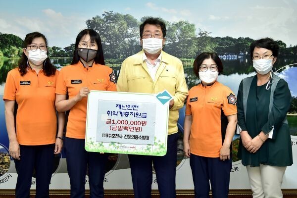 최미정 대장을 비롯한 소방대 간부들은 지난 26일 제천시청 시장실을 방문해 수해민들을 위해 써달라며 1백만원의 지원금을 이상천 제천시장에게 전달했다.
