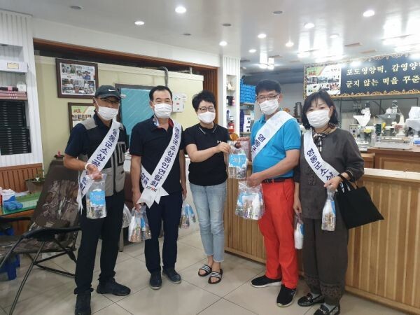 이들은 각자의 업무 분야에서 최선을 다해 노력하고 있는 회원들과 소상공인들의 힘을 북돋아주고자 영동군에서 지원받은 손소독제와 연합회에서 마련한 마스크 걸이, 그리고 약간의 간식을 준비했다.