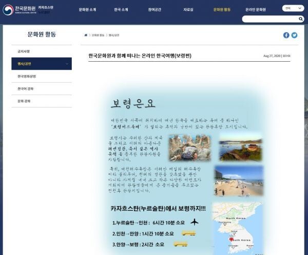 주카자흐스탄 한국문화원 홈페이지에 게재된 사진전은 보령시에 대한 소개와 카자흐스탄의 수도 누르술탄에서 인천공항을 거쳐 보령까지의 이동 시간은 물론 대천해수욕장 보령머드축제 외연도 충청수영성 대천항 패러글라이딩 시 야경 등을 사진으로 담아 내 소개했다.