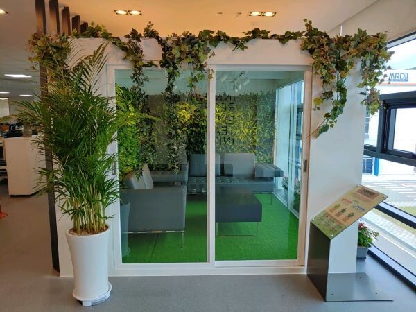 공기정화능력이 탁월한 아비스, 콩코 등의 식물을 벽면에 식재하고 관수·조명·공조·제어가 가능한 IOT 시스템을 설치해 근로자들이 편안하게 몸과 마음을 치유할 수 있는 공간을 조성했다.