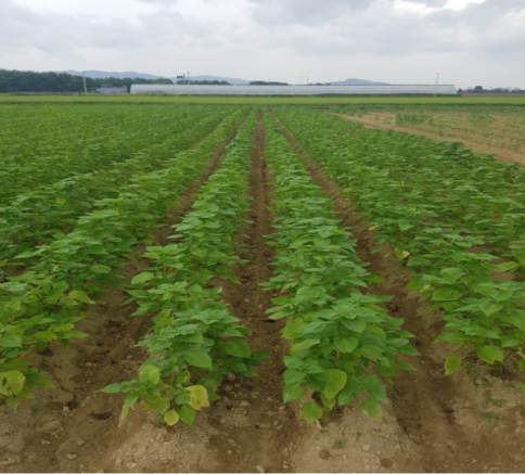 최장 장마로 인한 폭우와 평년대비 80시간 이상 부족한 일조량은 들깨 잎이 누렇게 변색되는 습해 증상과 마디와 마디사이가 길게 웃자라고 줄기 두께가 얇아져 쓰러짐을 유발시키는 생육 부진 현상을 초래한다.