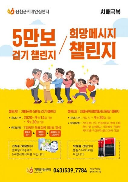 8일 군 치매안심센터에 따르면 이번 행사는 모바일플랫폼 ‘워크온’과 연계해 비대면으로 운영되며 진천군민이라면 누구나 참여 가능하다.