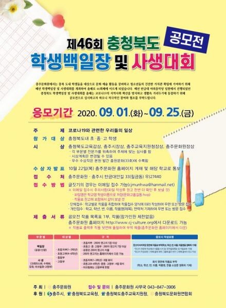 [무한뉴스] 충주문화원은 충주시와 충청북도교육청, 충주교육지원청, 충청북도문화원연합회의 후원으로 제46회 충청북도 학생백일장 및 사생대회 공모전을 실시한다.