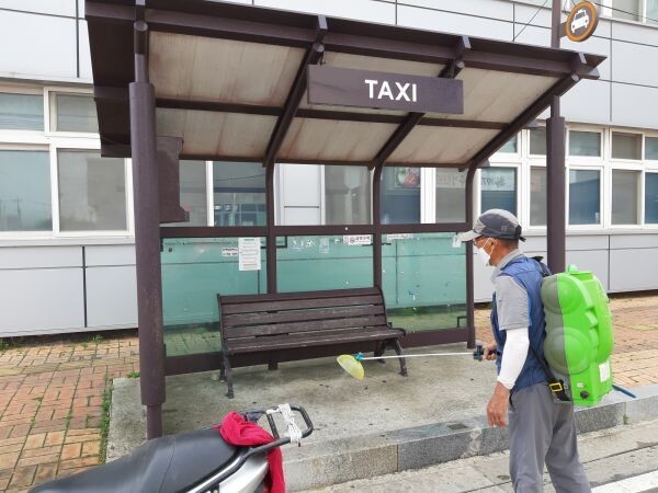 원수1리 김영재 이장이 그 주인공으로 주민들의 코로나19 예방을 위해 4개월째 장항읍에 있는 버스정류장과 택시승강장 33개소를 순회하며 소독하고 있다.