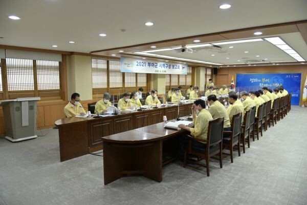 [무한뉴스] 부여군은 17일 군청 서동브리핑실 및 재난종합상황실에서 박정현 군수를 비롯한 전 실과소장과 읍·면장 등이 참석한 가운데 2021년 시책구상 보고회를 개최했다.