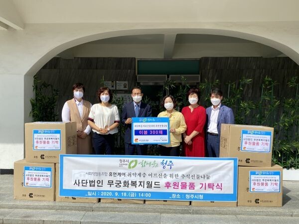기탁식에는 이재숙 복지국장, 이충우 사단법인 무궁화복지월드 충북희망나눔 자원봉사단장, 송유정 사회적협동조합 휴먼케어 이사장이 참석했다.