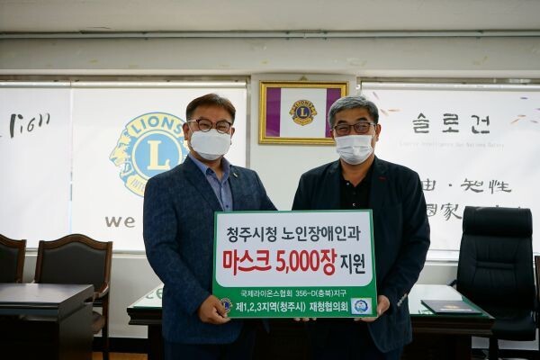 [무한뉴스] 국제라이온스협회356-D지구 1,2,3지역 재청협의회가 28일 청주시 노인장애인과에 생활이 어려운 장애인들에게 전달해 달라며 마스크 5000장을 기탁했다.