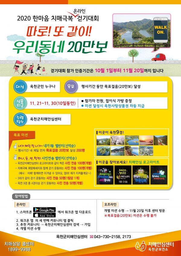 [무한뉴스] 옥천군치매안심센터에서는 지난 10월 1일부터 오는 11월 20일까지‘따로 또 같이 우리동네 20만보, 2020 한마음 치매극복 걷기대회’를 온라인으로 개최한다.