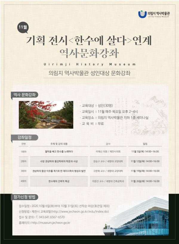 [무한뉴스] 제천 의림지 역사박물관은 오는 11월 성인대상 교육프로그램 제2회 역사문화강좌를 개최한다.