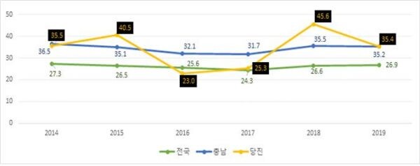 통계청이 지난달 22일 발표한 ‘2019년 사망원인통계’에 따르면 당진시 2019년 자살사망자 수는 59명으로 2018년 76명에서 17명 감소했으며 자살률은 35.4명으로 2018년 45.6명에 비해 10.2명이 감소했다.