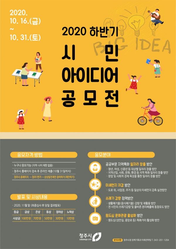시 관계자는 “이번 시민아이디어 공모전은 부서별 주요 현안문제를 종합해 분야별 시민 아이디어를 구하고자 개최하게 됐다”며“시민 여러분께서는 우리 지역 문제해결을 위해 참신한 아이디어를 제안해주길 바란다”고 말했다.