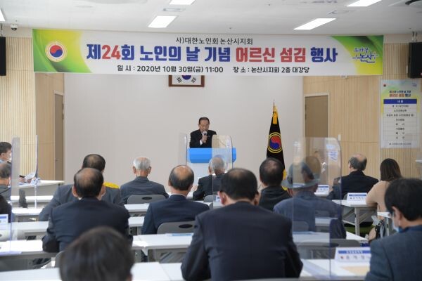 대한노인회 논산시지회가 주관하는 노인의 날 행사는 매년 시민운동장에서 대규모 행사로 개최되었으나 올해는 코로나19 확산방지를 위해 참석인원을 최소화하고 사회적 거리두기를 실천하는 등 방역수칙을 철저하게 준수하며 행사를 진행했다.