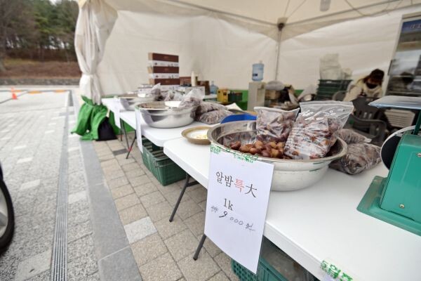 이번 판매장은 코로나19 장기화와 올 여름 잦은 비로 일조량이 낮아 알밤 판매 및 수확량이 저조해 어려움을 겪고 있는 지역 알밤 생산 농가를 돕기 위해 마련됐다.