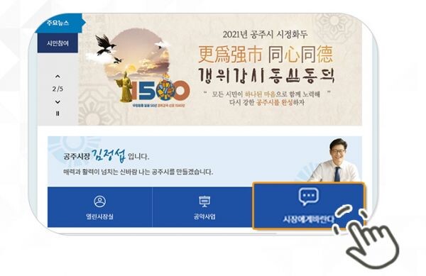 김정섭 시장은 6일 열린 정례브리핑을 통해 공주시 발전에 대한 제안, 건의사항 등 다양하고 진솔한 의견을 가감 없이 올릴 수 있는 공주시청 홈페이지 열린 게시판 ‘시장에게 바란다’를 보다 활성화시킬 계획이라고 밝혔다.