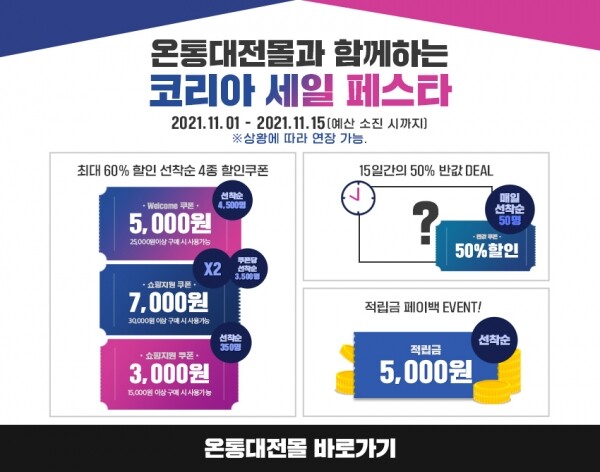 또한, 매일 특정상품을 선착순으로 구매한 50명에게 최대 1만 5천원 절반가격으로 판매하는 ‘반값 딜’행사가 진행되며 5만원 이상 구매고객 선착순 2,021명에게는‘적립금 페이백’ 5천 원이 지급된다.