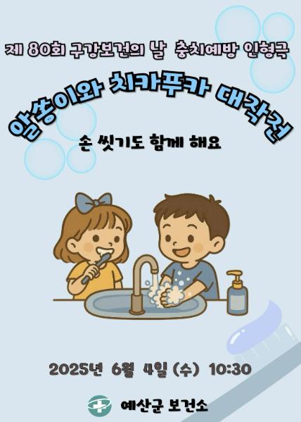 [무한뉴스=정민정 기자] 예산군보건소는 제80회 구강보건의 날(6월 9일)을 맞아 건강한 구강생활 실천 분위기를 조성하고자 오는 6월 4일 예산군청 추사홀에서 충치예방·손 씻기 어린이 인형극을 개최한다.